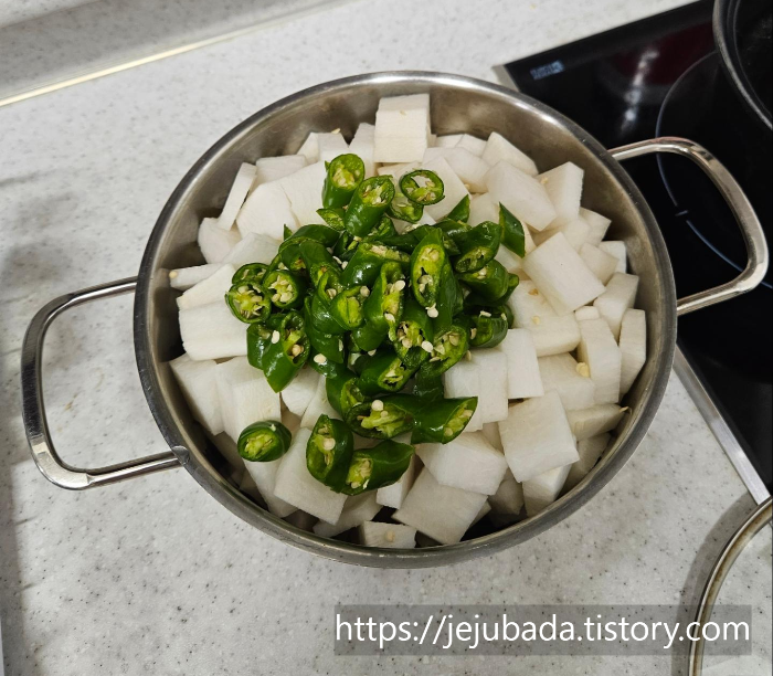 * 청양고추는 매운 맛을 원하면 통으로, 순하게 즐기고 싶다면 씨를 빼고 썰어 넣어줍니다.
