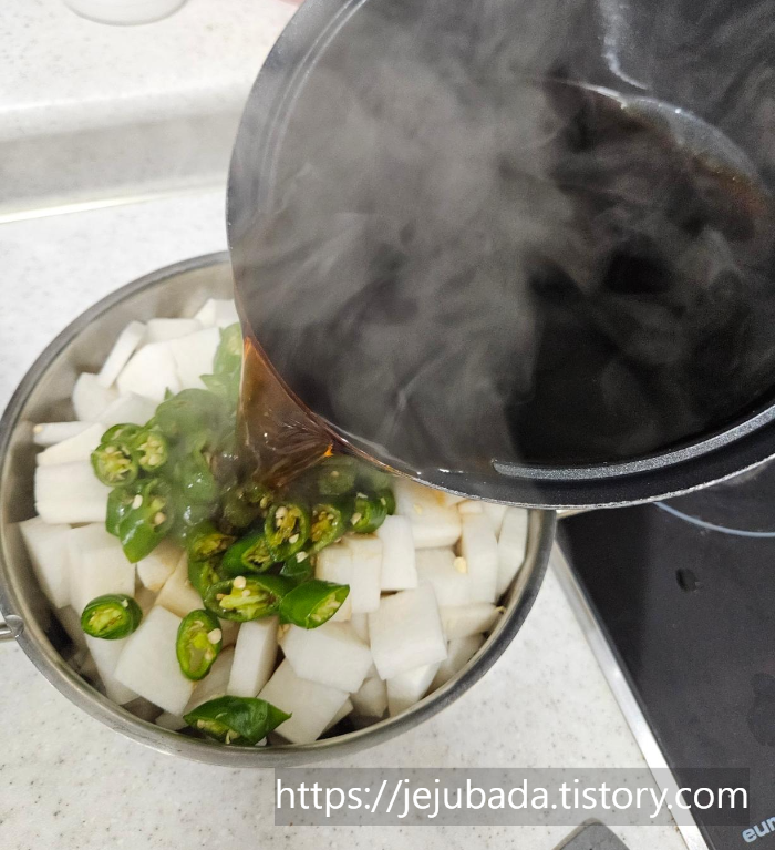 끓인 국물을 바로 준비한 재료 위에 붓고, 뚜껑을 닫아 식혀줍니다.