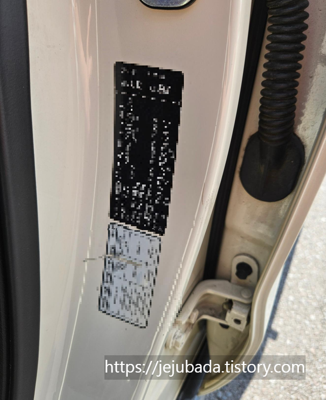 차대번호는 운전석 문을 열면 검은색 스티커에 표기되어 있어요.